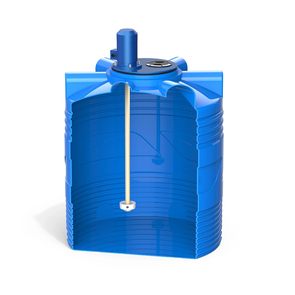Ёмкость изготовлена из пищевого полиэтилена, устойчива к механическим нагрузкам и химически нейтральна. Крышка, вал и рабочее колесо выполнены из прочного композитного материала, что гарантирует надёжность и стойкость к агрессивным средам.