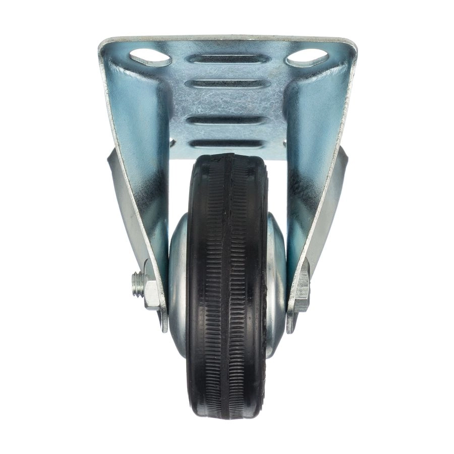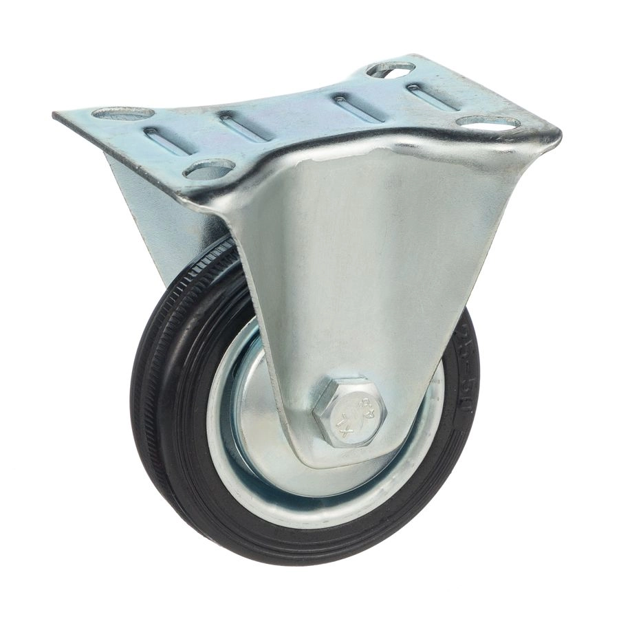 Колесо неповоротное 4002-75, диаметр 75мм., грузоподъемность 50кг. Колеса из черной литой резины, центр из двух гальванизированных дисков из штампованной стали. Роликовый (игольчатый) подшипник расположен в углублении, выдавленном под прессом, и содержит цилиндрические ролики подшипника. Неповоротный кронштейн изготовлен прессованием из листовой стали. Возможно применение на относительно грубых полах складов, заводов, производственных и строительных площадках. Данные колеса можно использовать на неровных поверхностях, во влажной окружающей среде и использовании вне помещения, не рекомендуется применять в среде с органическими растворителями, хлорированными веществами, гидрокарбонатами и минеральными маслами. Температура эксплуатации от -20 до +70С.