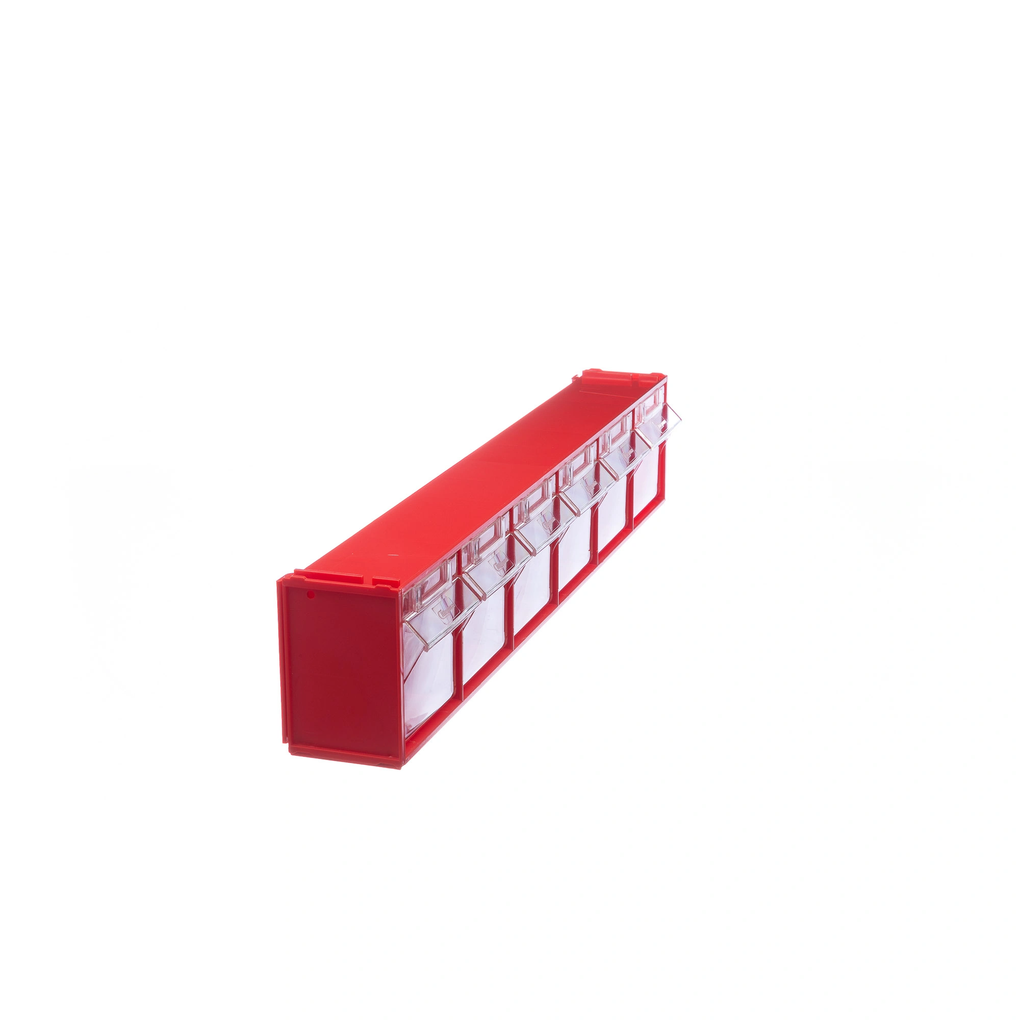 Короб откидной Стелла-техник F-600-6 (600х96х112мм.) 6 ячеек, красный, прозрачный служит для хранения мелкоштучных предметов. Данная система хранения не подвержена случайному опрокидыванию. Откидные стандартные ячейки обеспечивают быстрый доступ к необходимым предметам. В случае необходимости полного высыпания или наполнения внутренние ячейки легко извлекаются. Полезный внутренний размер каждой ячейки 88х65х70мм. Специальный пластик, из которого выполнен короб, выдерживает значительные нагрузки и обладает оптимальной эластичностью. На основе данных коробов можно сформировать многоярусную систему хранения вертикально, в том числе и с коробами других размеров, таких как F-600-9, F-600-5 и F-600-4 по принципу пирамиды. Использование в качестве дополнительного элемента специальных металлических рам, позволяет комплекту коробов нести большие нагрузки в напольном, настольном и настенном варианте. Короб данной модели легко можно прикрепить к стене или установить на специальные кронштейны (Артикул: Кронштейны-FOX-750). Обзорность содержимого сквозь прозрачные внутренние ячейки, наличие отсека для информационных бирок, легкое извлечение внутреннего короба для опустошения и наполнения, все это является неоспоримым преимуществом откидных коробов серии F. Температура эксплуатации от -10 до +70С.