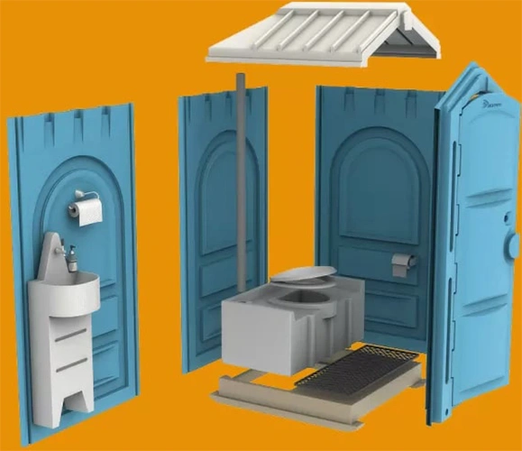 - Биотуалет с раковиной. В комплект входит блок умывальника на 30 л, который регулируется ножной помпой. При этом система полностью автономна – пользоваться ей можно вдали от коммуникаций и водопровода.