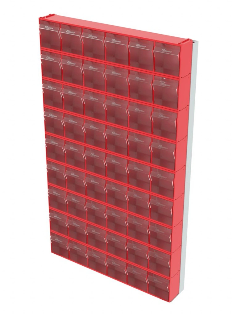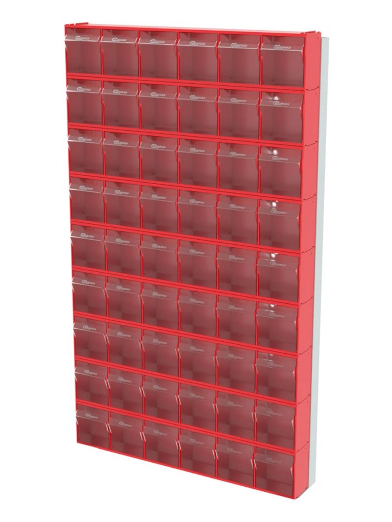 Стойка Стелла-техник 402-00-09-00 (610х40х1000) настенная представляет собой удобную систему хранения на основе откидных коробов, которая подойдет для использования в выставочных залах, магазинах, складах. Стойка крепится на стену при помощи саморезов или анкерных болтов (крепеж не входит в комплект и подбирается под уровень загруженности стойки). Комплектация: Рама FOX (610х40х1000h) V402 - 1 шт.; Короб откидной Стелла-техник F-600-6 , 600х96х112мм, 6 ячеек, красный, прозрачный - 9 шт.; Упаковка. Преимущества: Металлическое основание; Значительная устойчивость; Хорошая вместимость; Длительный срок службы.