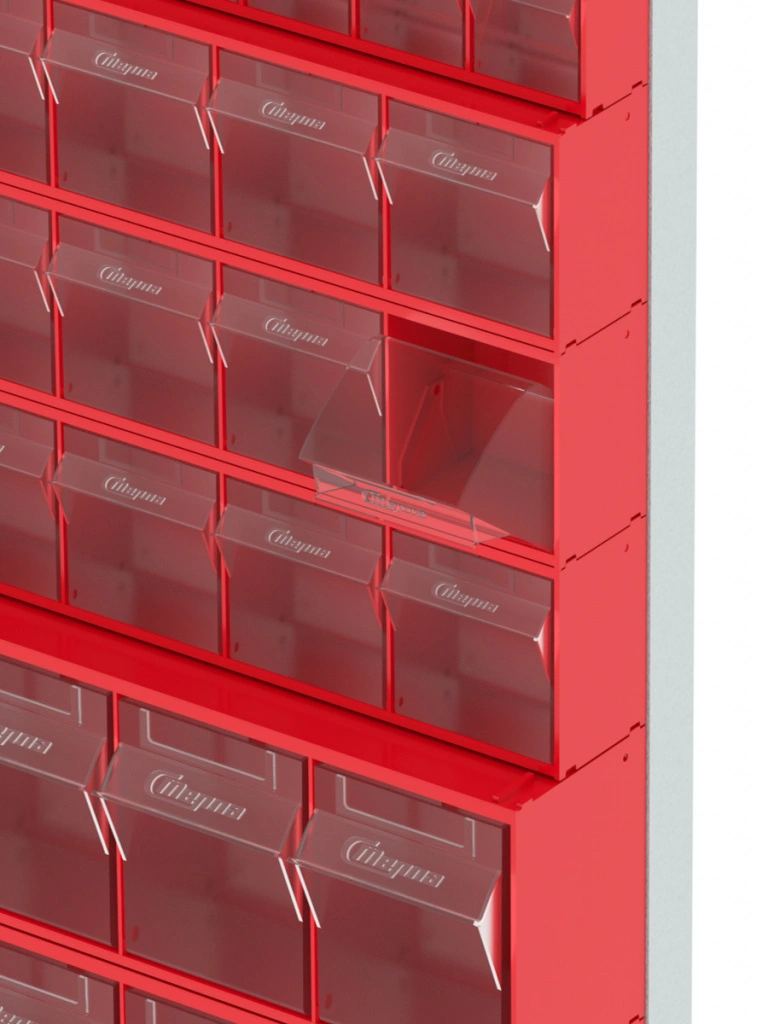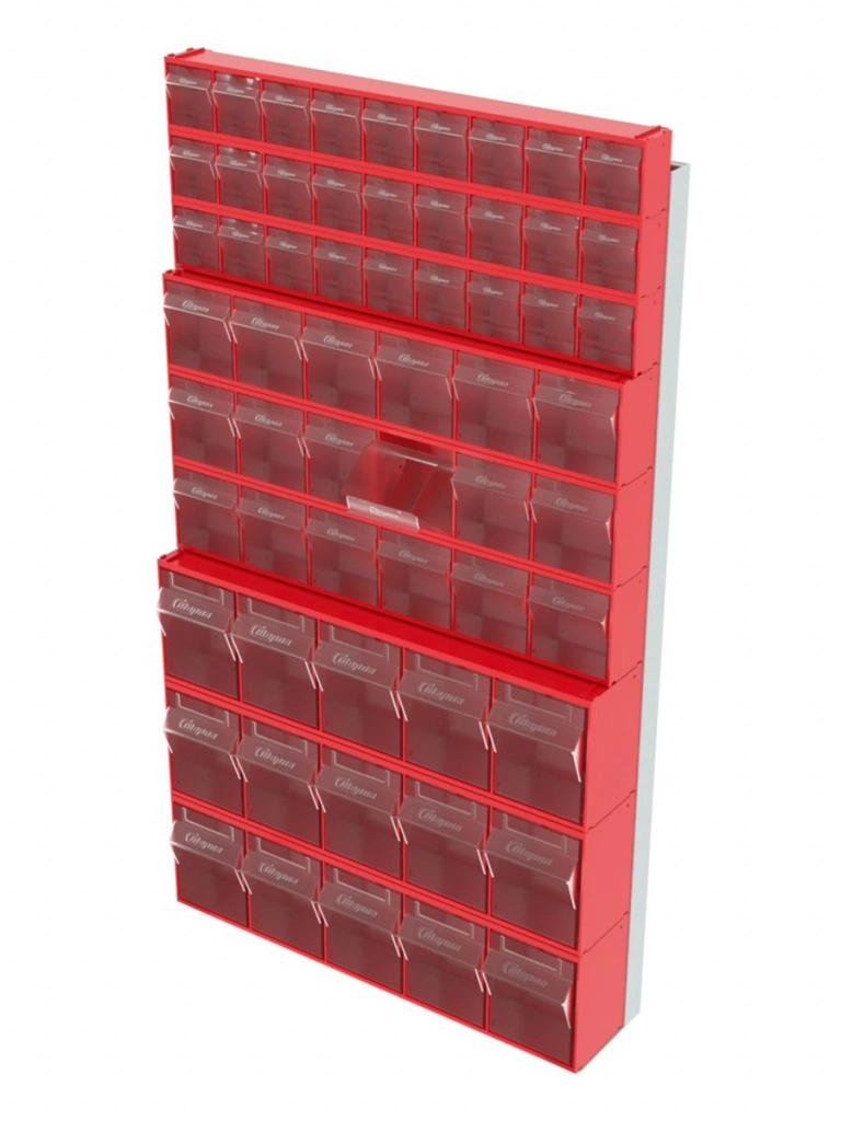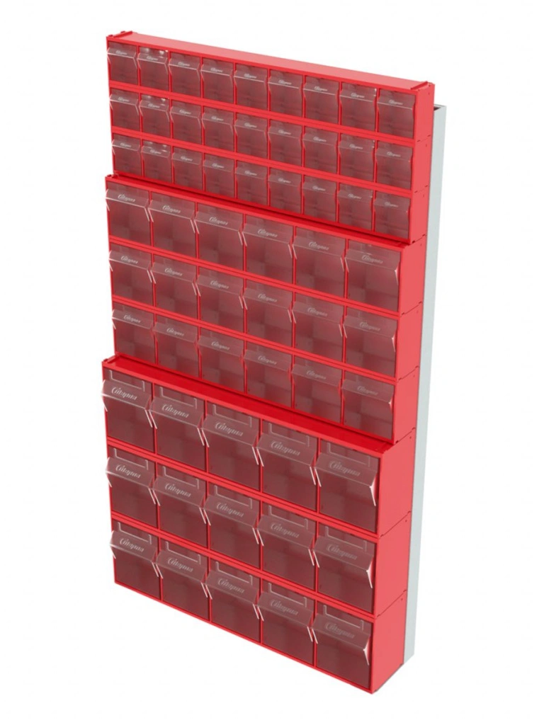 Стойка настенная Стелла-техник 402-03-03-03 (610х40х1000) представляет собой удобную систему хранения на основе откидных коробов, которая подойдет для использования в выставочных залах, магазинах, складах. Стойка крепится на стену при помощи саморезов или анкерных болтов (крепеж не входит в комплект и подбирается под уровень загруженности стойки). Комплектация: Рама FOX (610х40х1000) V402 - 1 шт.; Короб откидной Стелла-техник F-600-9 , 600х68х78мм, 9 ячеек, красный, прозрачный - 3 шт.; Короб откидной Стелла-техник F-600-6 , 600х96х112мм, 6 ячеек, красный, прозрачный – 3 шт.; Короб откидной Стелла-техник F-600-5 , 600х140х168мм, 5 ячеек, красный, прозрачный – 3 шт.; Упаковка. Преимущества: Металлическое основание; Значительная устойчивость; Хорошая вместимость; Длительный срок службы.
