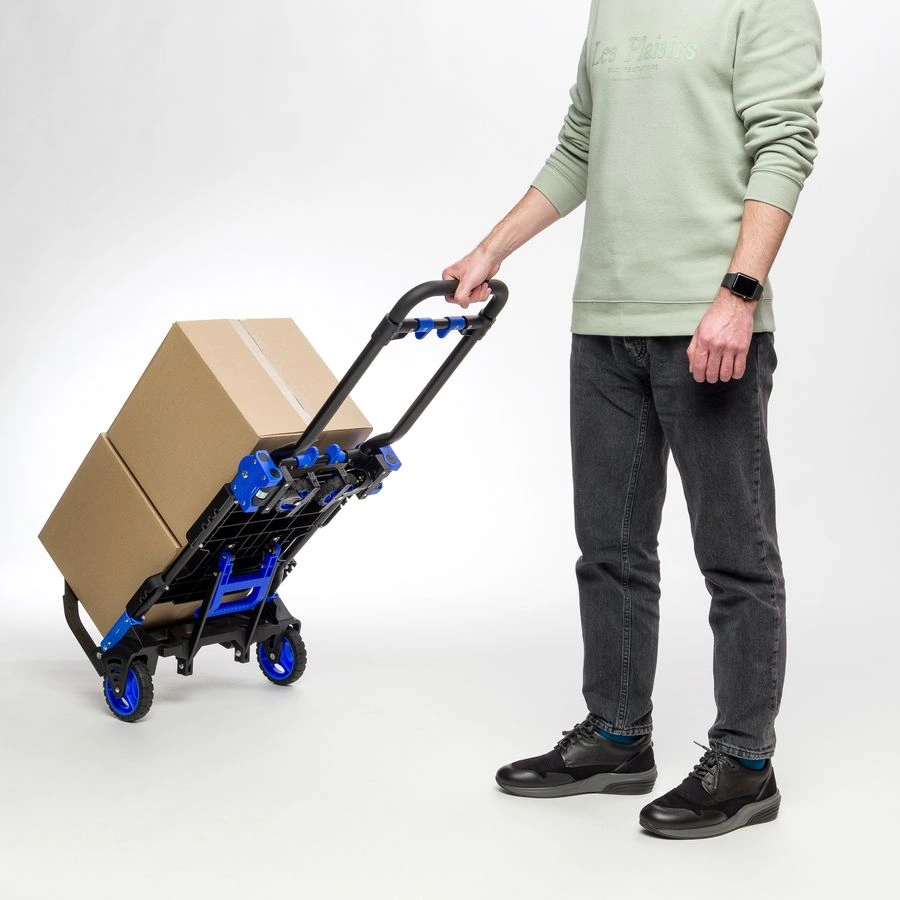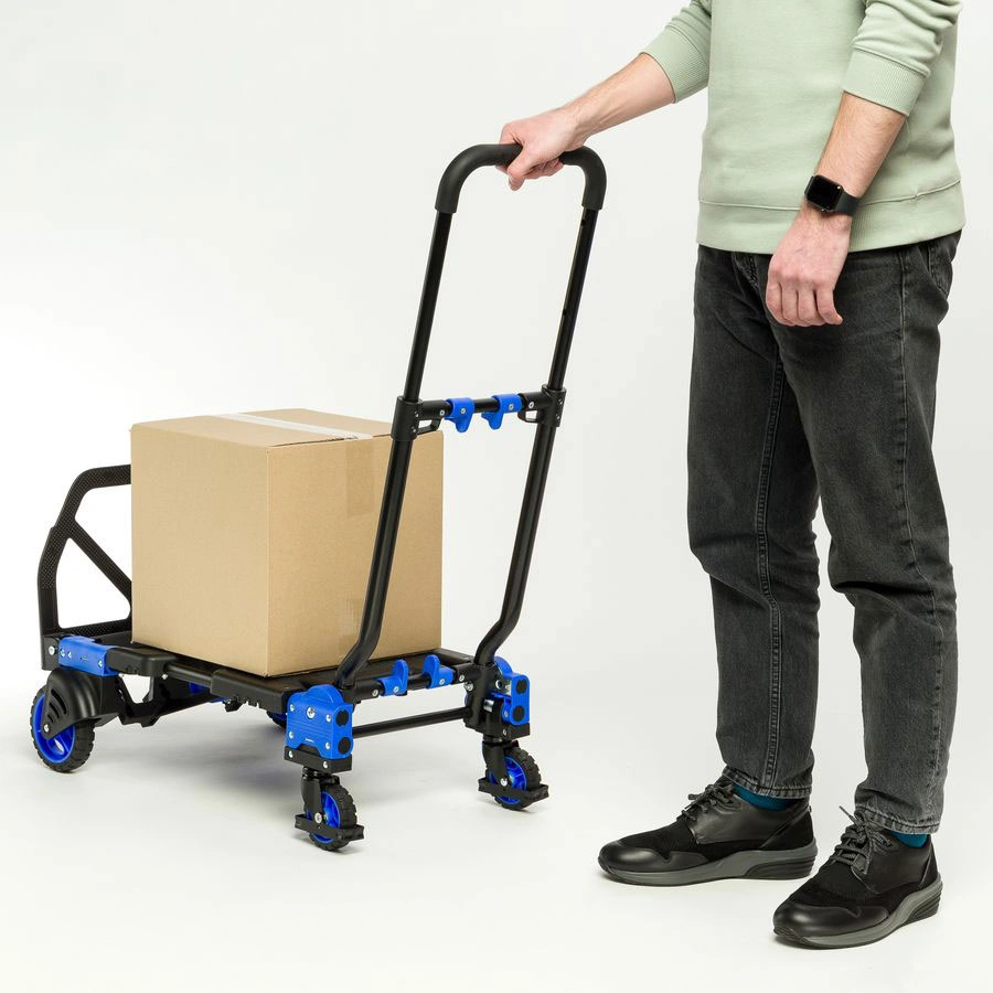 Тележка трансформер MagnaCart FW-90TP складная универсальная тележка предназначена для работы с разного рода грузами. Тележка может использоваться как двухколесная, при необходимости трансформируется в четырехколесную тележку и может использовать в наклонном варианте. Складные тележки идеально подходят для транспортировки выставочного оборудования, обслуживания маленьких складов и перевозки грузов в домашних условиях или во время путешествий. В сложенном виде, за счет компактных размеров тележку можно легко разместить в багажнике машины. Ручка стальная с термопластичной резиной. Платформа - PP (полиуретан). Откидная платформа - сталь. Колеса из термопластичной резины: 2 малых диаметром 90 мм и 2 больших диаметром 125 мм. Высота ручки в рабочем состоянии: в четырехколесном платформенном варианте минимум 685 мм, максимум 920 мм, в двухколесном варианте минимальная высота 1100 мм, максимальная 1340 мм. В двухколесном варианте тележка может перевозить грузы весом до 68 кг. В горизонтальном положении на четырех колесах грузоподъемность тележки до 138 кг. Габариты тележки в сложенном виде 416х450х110 мм. Собственный вес тележки 7,3 кг.